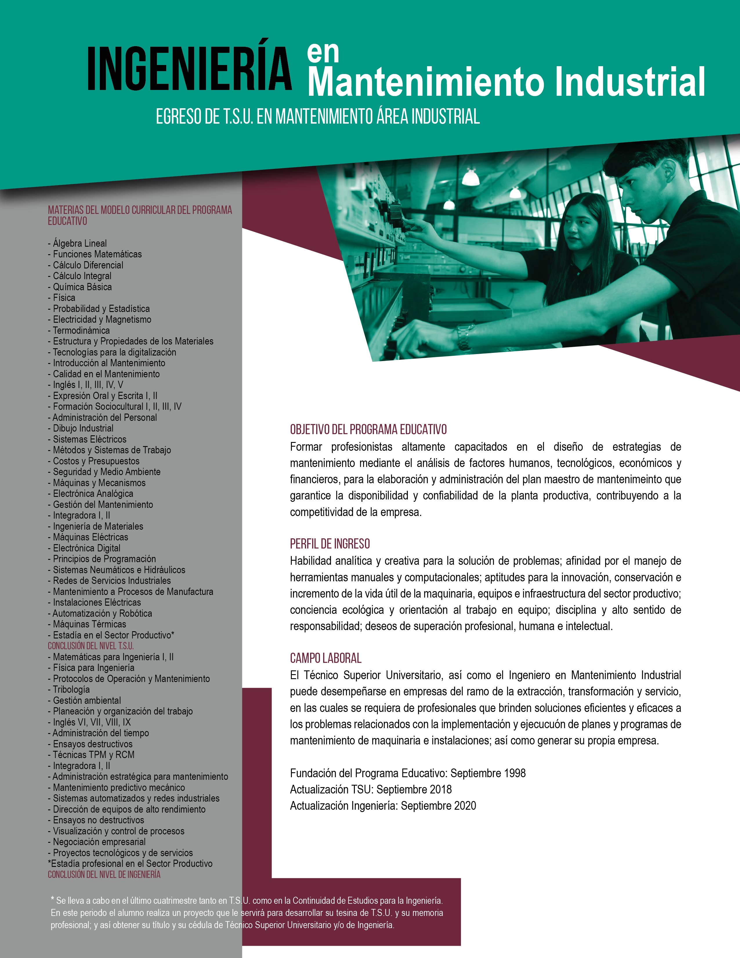 Formar profesionistas altamente capacitados en el diseño de estrategias de mantenimiento mediante el análisis de factores humanos, tecnológicos, económicos y financieros, para la elaboración y administración del plan maestro de mantenimiento que garantice la disponibilidad y confiabilidad de la planta productiva.